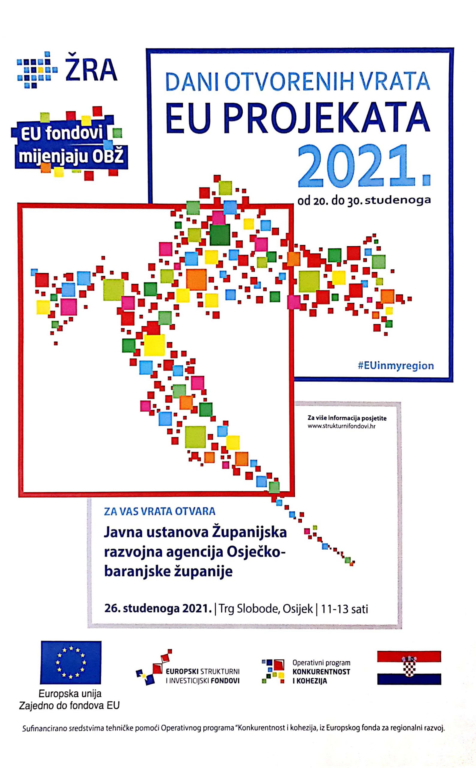 Pozivamo Vas da sutra 26.studenog 2021. od 11 do 13 sati posjetite Trg slobode na kojem ćemo predstaviti projekte financirane sredstvima EU u sklopu „Dana otvorenih vrata EU projekata“ koje organizira Javna ustanova Županijska razvojna agencija Osječko-baranjske županije.